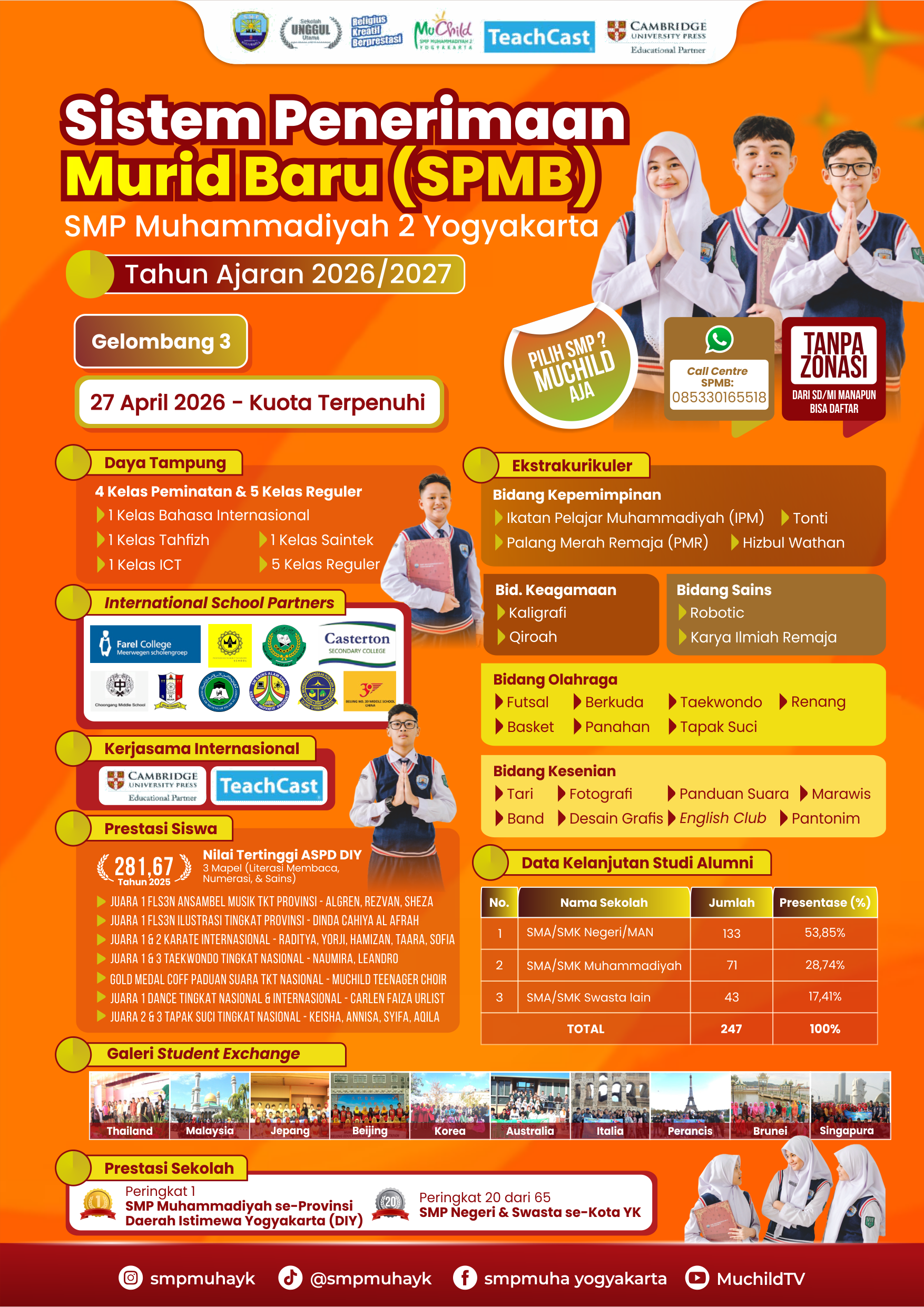 | Kami sampaikan bahwa : SPMB SMP Muhammadiyah 2 Yogyakarta (Muchild) Gel. 1 Mulai 01 Oktober 2025 | |